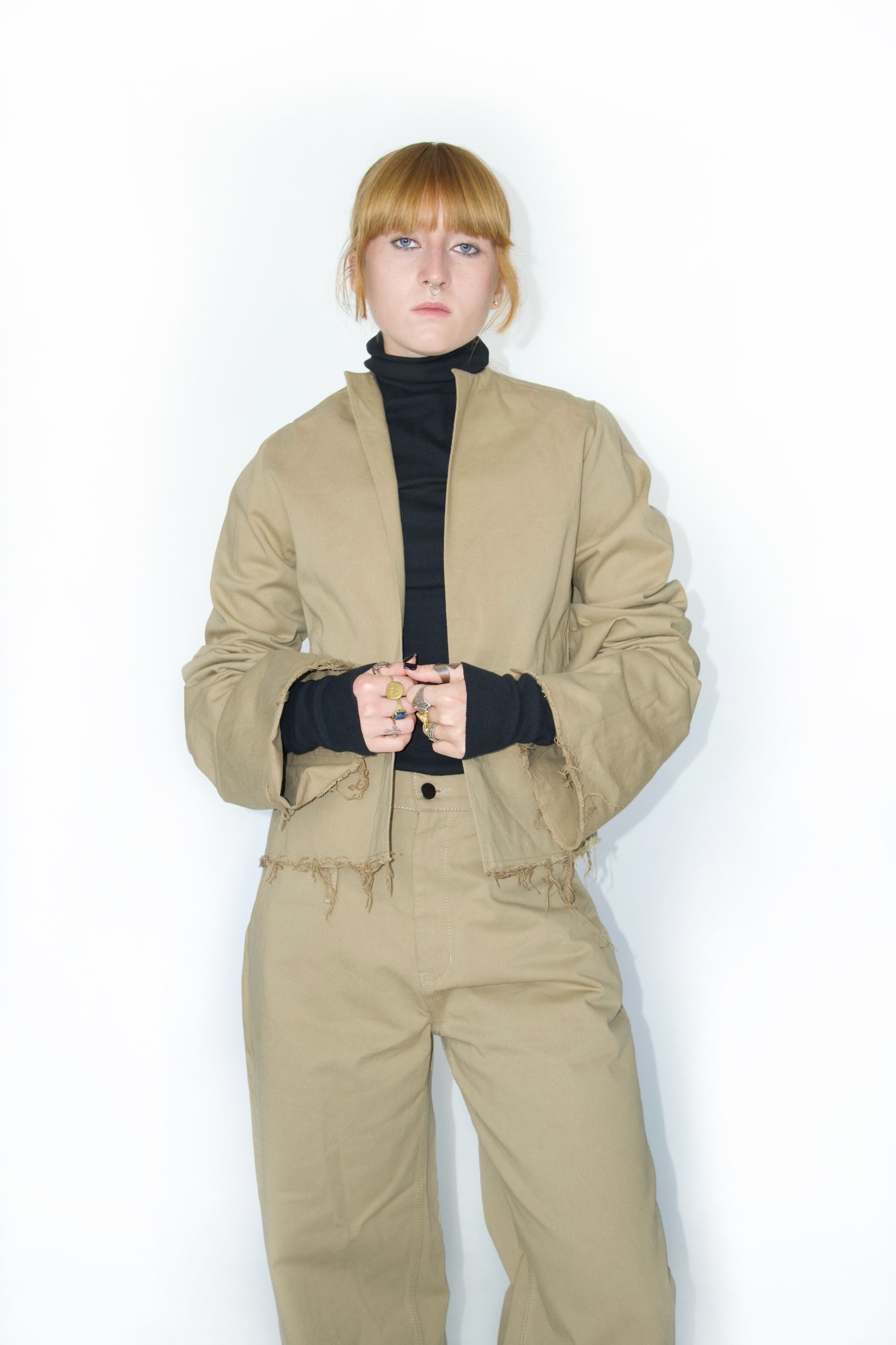 Japanese selvage denim is a material known as one of the highest quality denims available. The fabric is characterized by its strength and high resistance to fading. A typical feature of 'self-edge' denim is the white edge, which are finished during the weaving process and can thus be used in garments without additional operations. This denim is woven in Kyoto and dyed in Hiroshima.