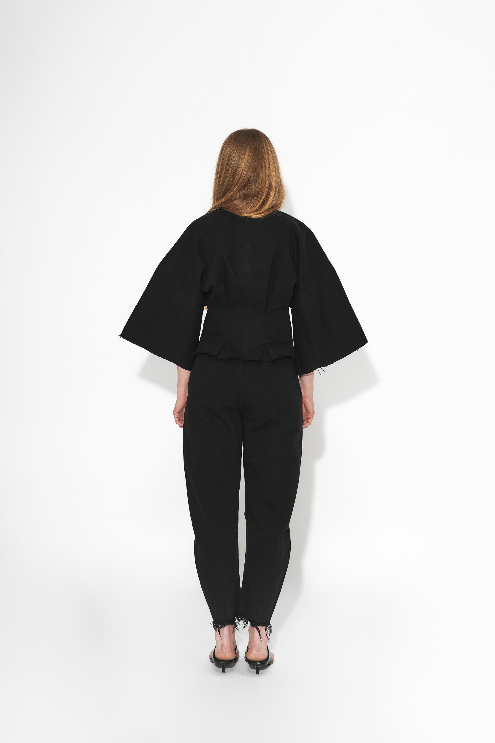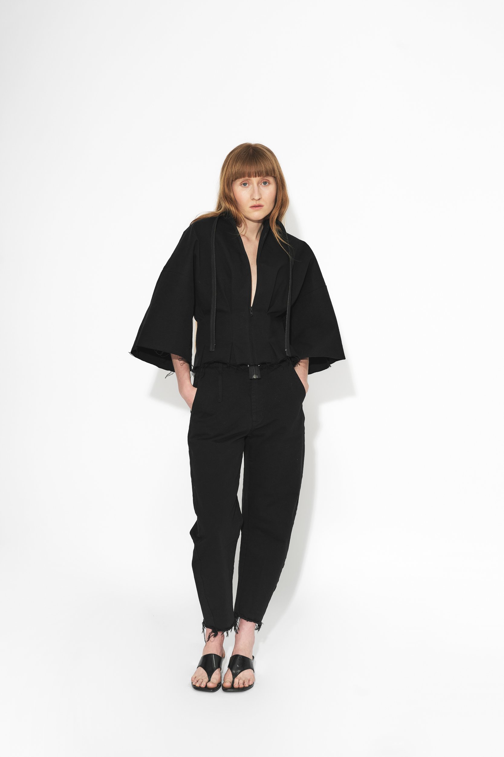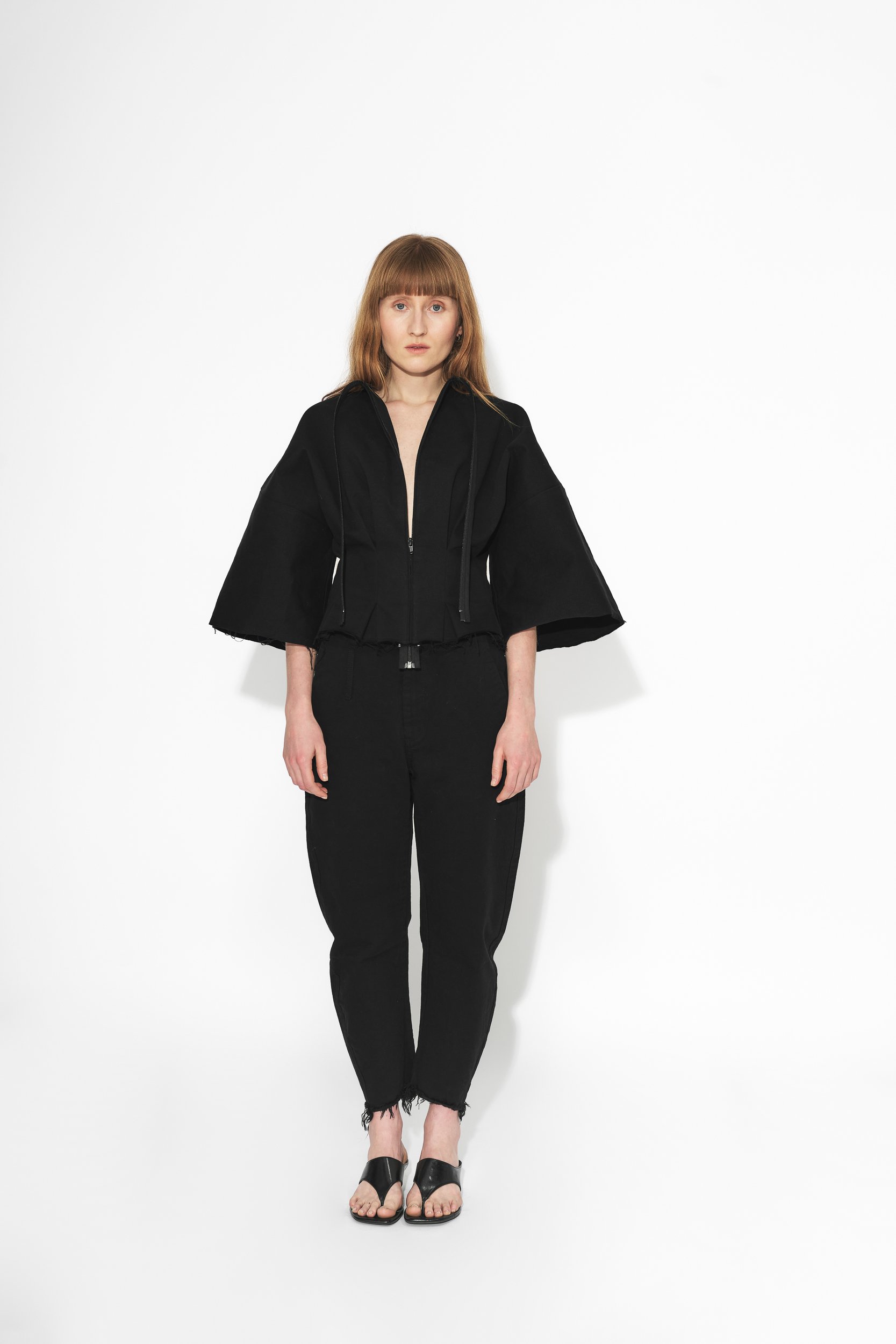 Vypasovaná bunda se širokými rukávy, variabilním rukávy. Nosit je můžete delší nebo založené a připnuté zevnitř, což odhalí paže a vytvoří sošnou siluetu pro speciální příležitosti. Prodloužený zip na přední straně slouží nejen jako praktické zapínání, ale též jako estetický prvek. Bunda má volně střižené okraje s prošitím. Bunda je vyrobena z japonského Selvage denimu.