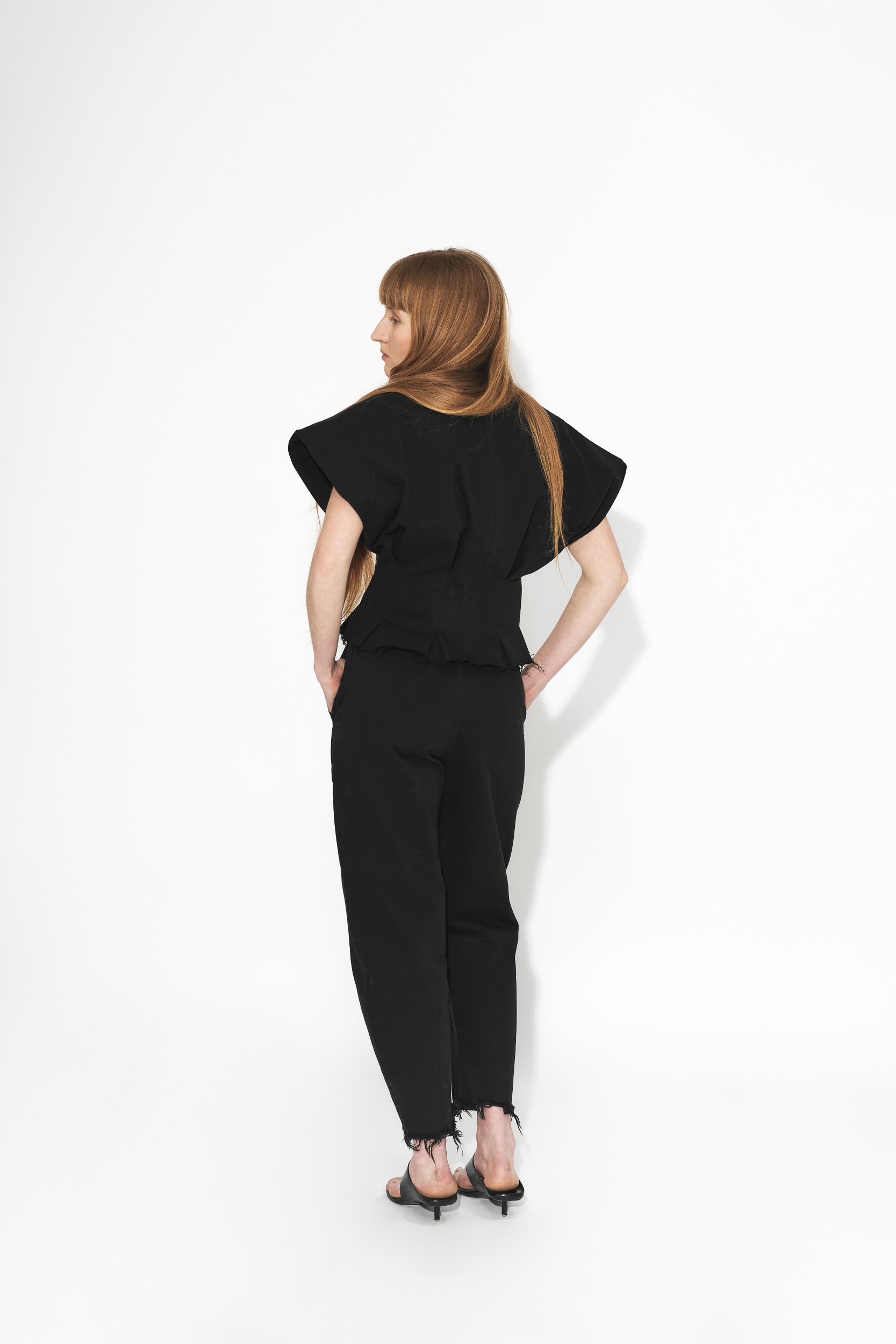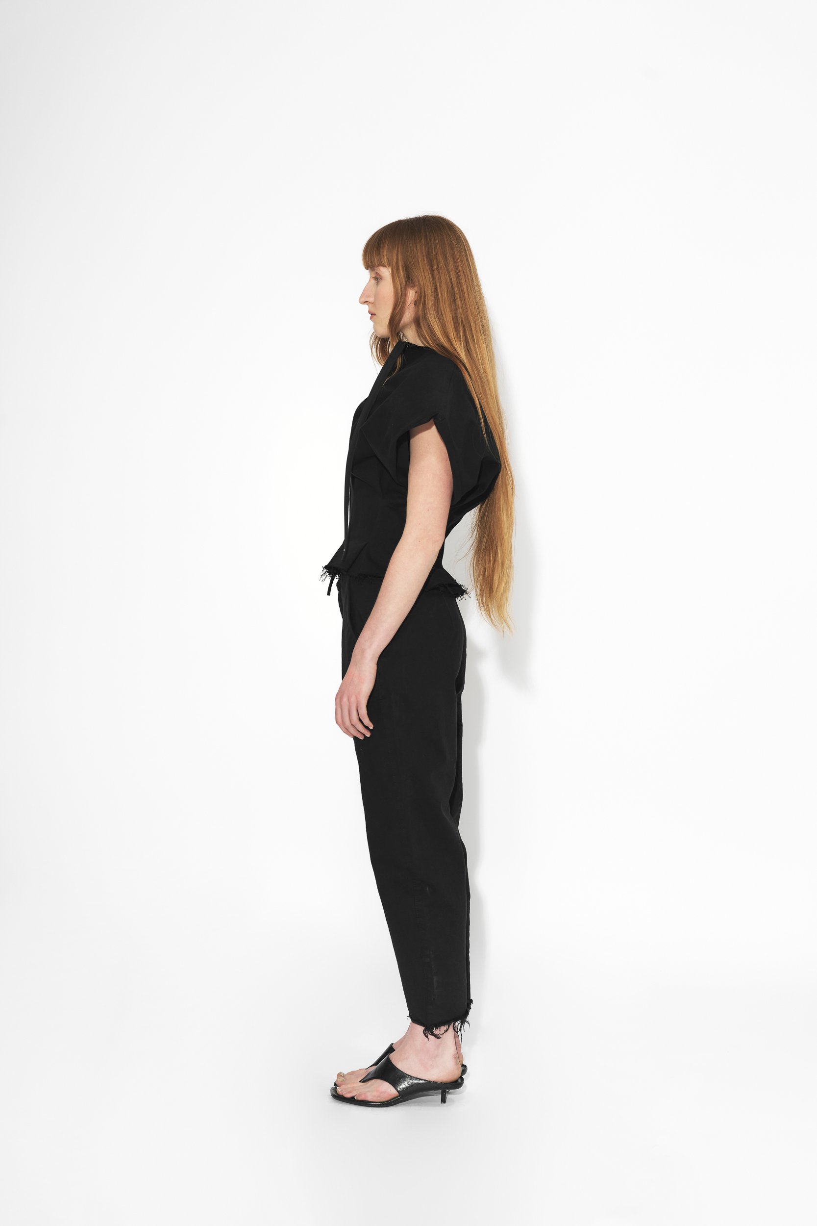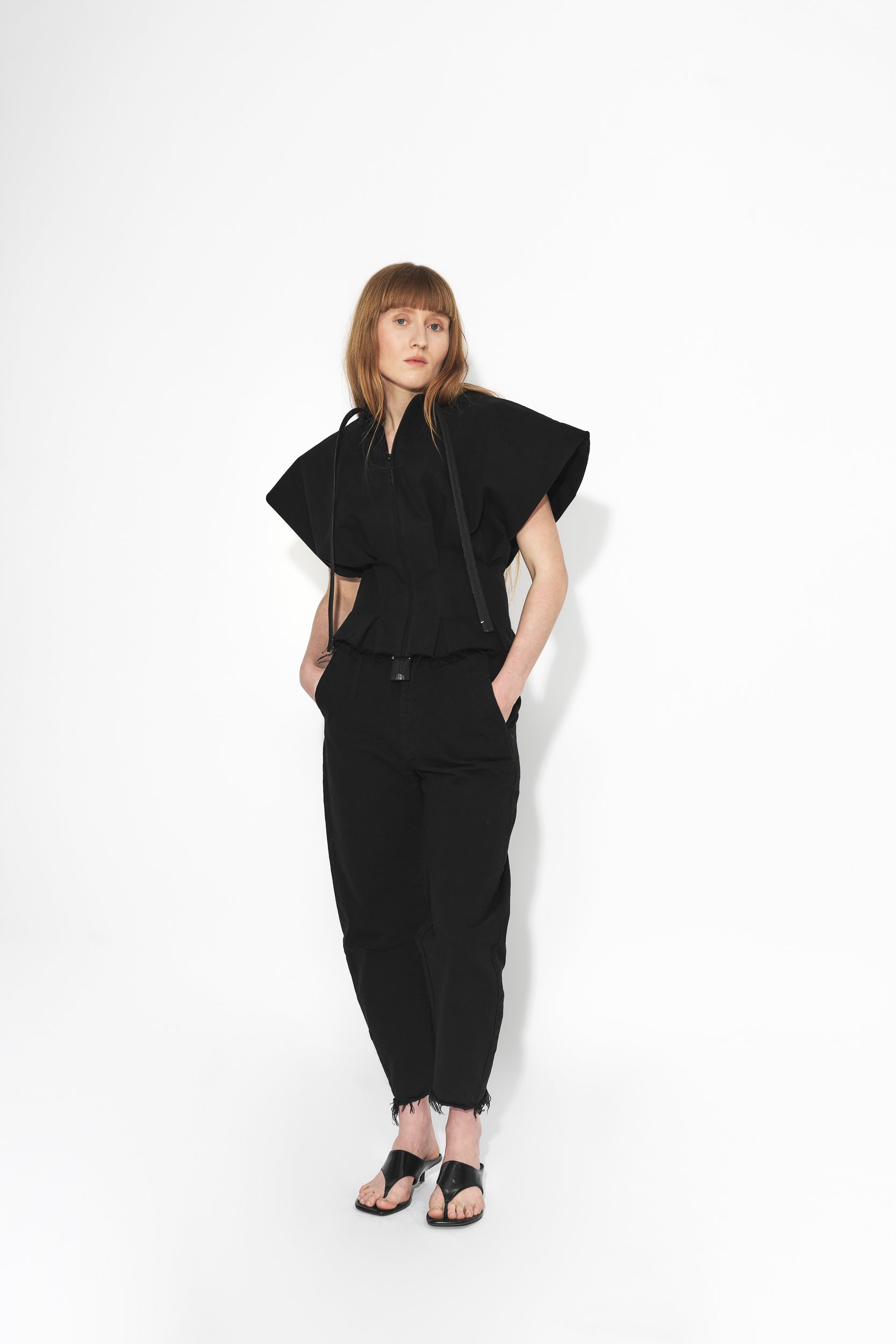Vypasovaná bunda se širokými rukávy, variabilním rukávy. Nosit je můžete delší nebo založené a připnuté zevnitř, což odhalí paže a vytvoří sošnou siluetu pro speciální příležitosti. Prodloužený zip na přední straně slouží nejen jako praktické zapínání, ale též jako estetický prvek. Bunda má volně střižené okraje s prošitím. Bunda je vyrobena z japonského Selvage denimu.