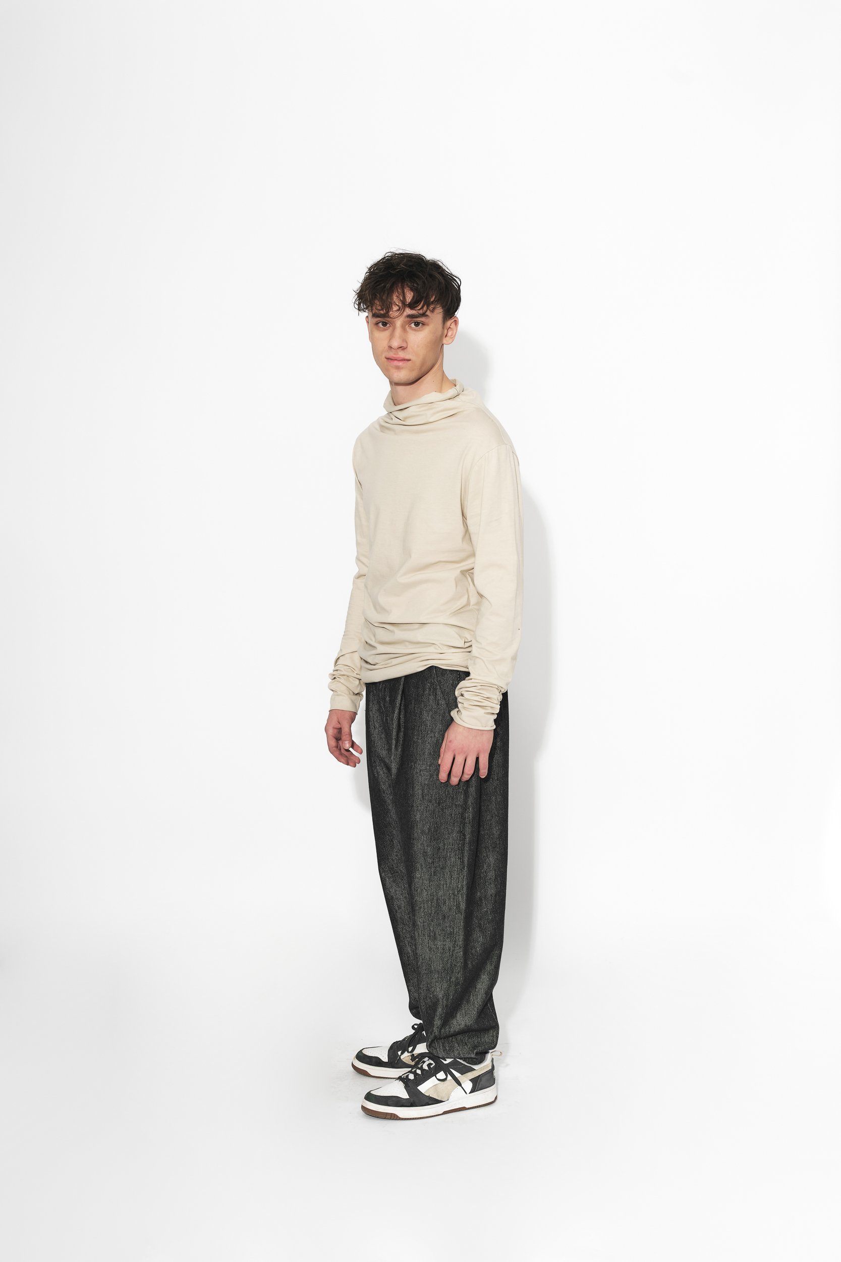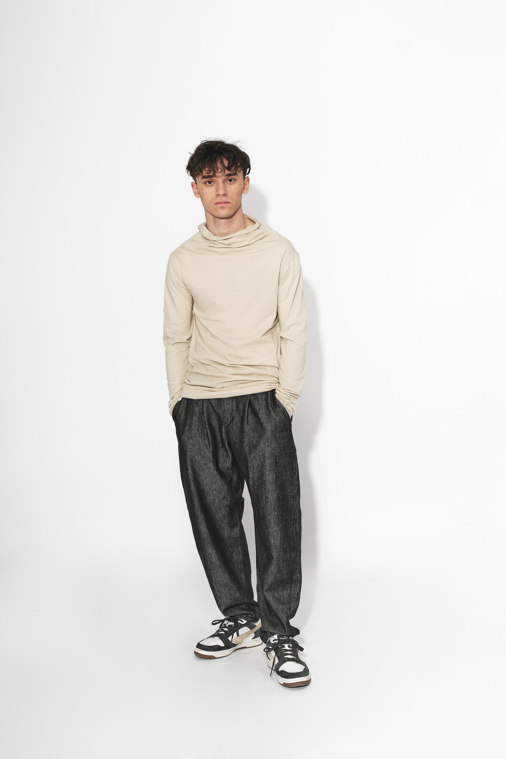 Pánský top Forma 02 se vyznačuje minimalistickým designem s úzkou siluetou. Bez zbytečných rušivých prvků. Je vyroben z prémiového japonského bavlněného úpletu, který je jemný na dotek a velmi příjemný na nošení. Dlouhé úzké rukávy a čistá linie střihu vytvářejí štíhlou, elegantní siluetu, jež přirozeně podtrhuje postavu. Oproti topu Segment je doplněn o rolák. Design je promyšleně minimalistický – žádné zbytečné zdobení, žádné rušivé prvky – jen čistá forma a kvalita materiálu. Konce jsou ponechány volně střižené. Dostupný i v černé variantě.